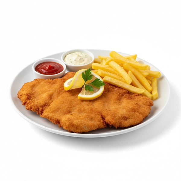 Schnitzel mit Pommes Frites und Saucen nach Wahl